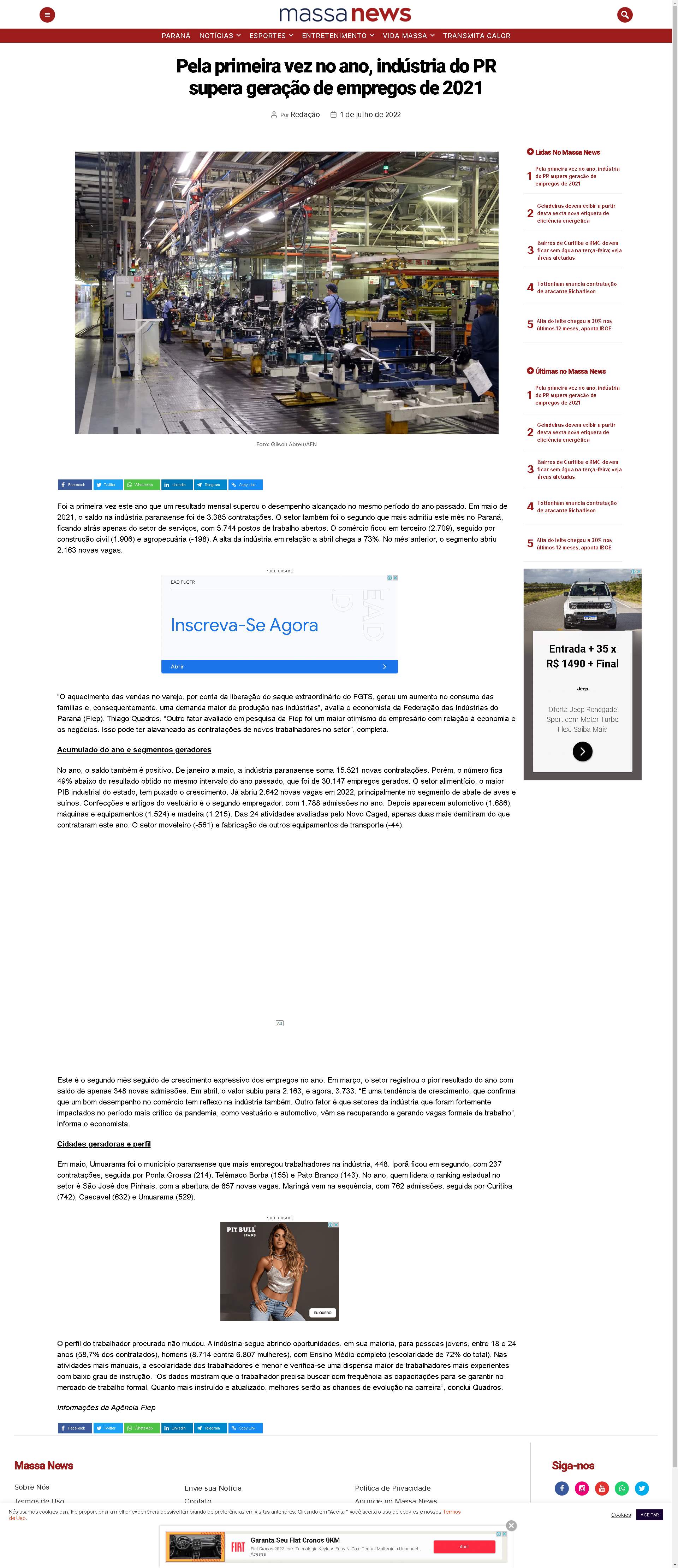 Foi a primeira vez este ano que um resultado mensal superou o desempenho alcançado no mesmo período do ano passado. Em maio de 2021, o saldo na indústria paranaense foi de 3.385 contratações. O setor também foi o segundo que mais admitiu este mês no