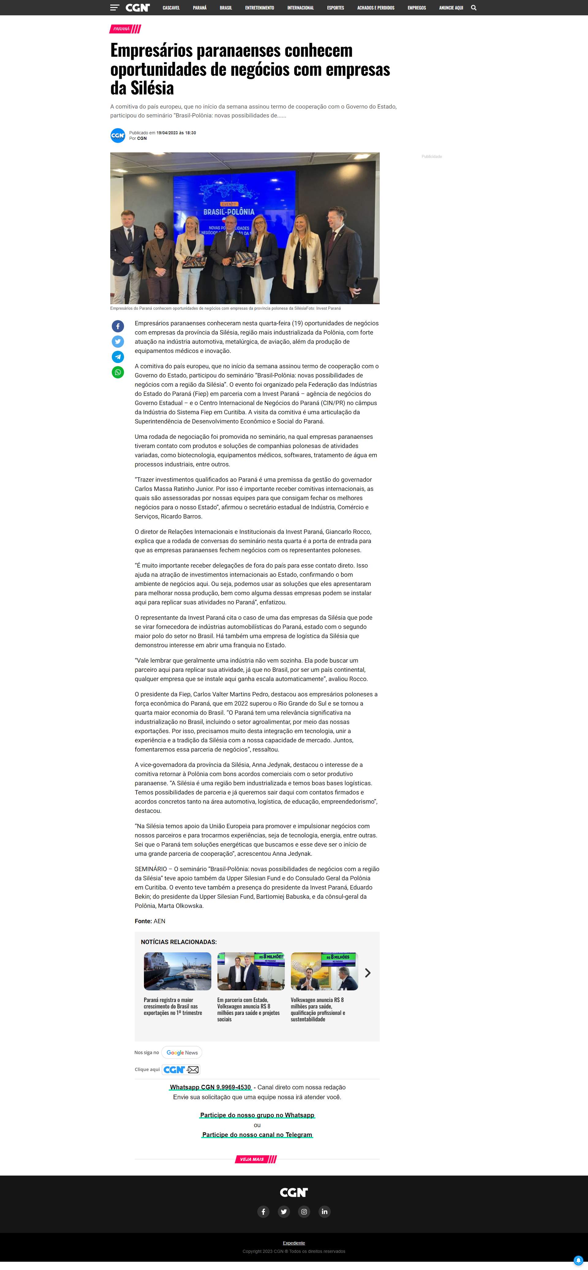 A comitiva do país europeu, que no início da semana assinou termo de cooperação com o Governo do Estado, participou do seminário “Brasil-Polônia: novas possibilidades de negócios com a região da Silésia”. O evento foi organizado pela Federação das Indústrias do Estado do Paraná (Fiep) em parceria com a Invest Paraná - agência de negócios do Governo Estadual - e o Centro Internacional de Negócios do Paraná (CIN/PR) no câmpus da Indústria do Sistema Fiep em Curitiba. A visita da comitiva é uma articulação da Superintendência de Desenvolvimento Econômico e Social do Paraná.