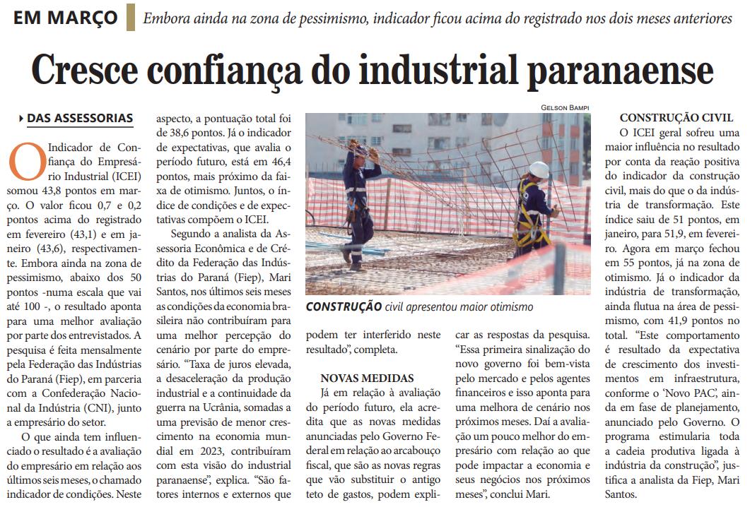 OIndicador de Confi ança do Empresário Industrial (ICEI) somou 43,8 pontos em março. O valor fi cou 0,7 e 0,2 pontos acima do registrado em fevereiro (43,1) e em janeiro (43,6), respectivamente. Embora ainda na zona de pessimismo, abaixo dos 50 pontos -numa escala que vai até 100 -, o resultado aponta para uma melhor avaliação por parte dos entrevistados. A pesquisa é feita mensalmente pela Federação das Indústrias do Paraná (Fiep), em parceria com a Confederação Nacional da Indústria (CNI), junto a empresário do setor. O que ainda tem infl uenciado o resultado é a avaliação do empresário em relação aos últimos seis meses, o chamado indicador de condições. Neste aspecto, a pontuação total foi de 38,6 pontos. Já o indicador de expectativas, que avalia o período futuro, está em 46,4 pontos, mais próximo da faixa de otimismo. Juntos, o índice de condições e de expectativas compõem o ICEI. Segundo a analista da Assessoria Econômica e de Crédito da Federação das Indústrias do Paraná (Fiep), Mari Santos, nos últimos seis meses as condições da economia brasileira não contribuíram para uma melhor percepção do cenário por parte do empresário. “Taxa de juros elevada, a desaceleração da produção industrial e a continuidade da guerra na Ucrânia, somadas a uma previsão de menor crescimento na economia mundial em 2023, contribuíram com esta visão do industrial paranaense”, explica. “São fatores internos e externos que podem ter interferido neste resultado”, completa. NOVAS MEDIDAS Já em relação à avaliação do período futuro, ela acredita que as novas medidas anunciadas pelo Governo Federal em relação ao arcabouço fi scal, que são as novas regras que vão substituir o antigo teto de gastos, podem explicar as respostas da pesquisa. “Essa primeira sinalização do novo governo foi bem-vista pelo mercado e pelos agentes fi nanceiros e isso aponta para uma melhora de cenário nos próximos meses. Daí a avaliação um pouco melhor do empresário com relação ao que pode impactar a economia e seus negócios nos próximos meses”, conclui Mari. CONSTRUÇÃO CIVIL O ICEI geral sofreu uma maior infl uência no resultado por conta da reação positiva do indicador da construção civil, mais do que o da indústria de transformação. Este índice saiu de 51 pontos, em janeiro, para 51,9, em fevereiro. Agora em março fechou em 55 pontos, já na zona de otimismo. Já o indicador da indústria de transformação, ainda fl utua na área de pessimismo, com 41,9 pontos no total. “Este comportamento é resultado da expectativa de crescimento dos investimentos em infraestrutura, conforme o ‘Novo PAC’, ainda em fase de planejamento, anunciado pelo Governo. O programa estimularia toda a cadeia produtiva ligada à indústria da construção”, justifi ca a analista da Fiep, Mari Santos.