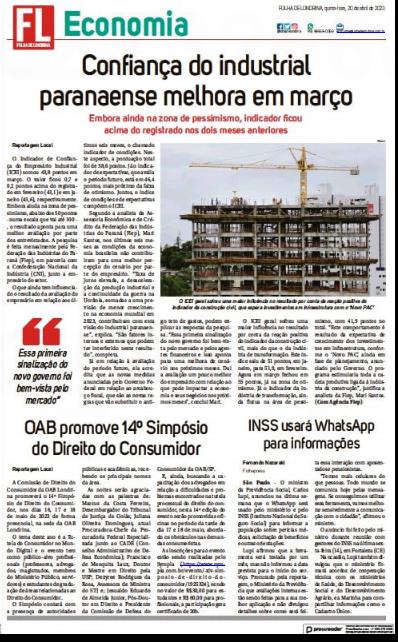 O Indicador de Confiança do Empresário Industrial (ICEI) somou 43,8 pontos em março. O valor ficou 0,7 e 0,2 pontos acima do registrado em fevereiro (43,1) e em janeiro (43,6), respectivamente. Embora ainda na zona de pessimismo, abaixo dos 50 pontos -numa escala que vai até 100 , o resultado aponta para uma melhor avaliação por parte dos entrevistados. A pesquisa é feita mensalmente pela Federação das Indústrias do Paraná (Fiep), em parceria com a Confederação Nacional da Indústria (CNI), junto a empresário do setor.